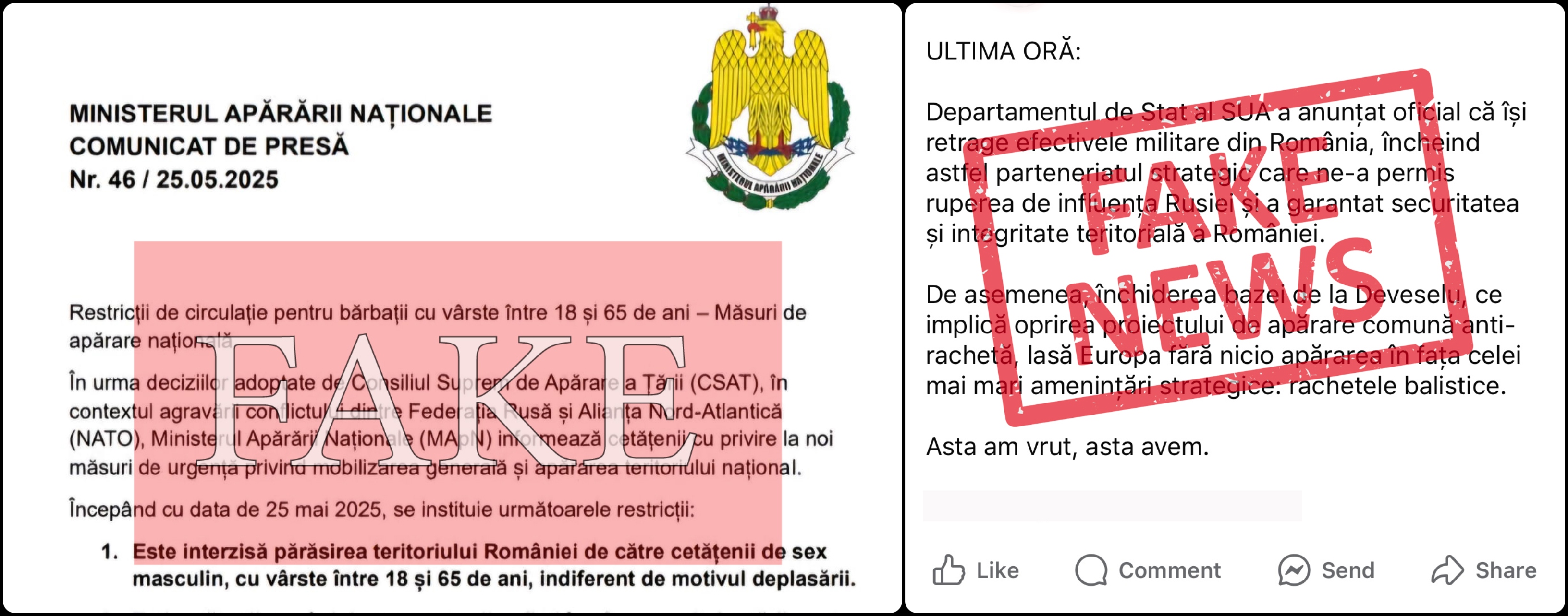 Semnalăm două noi încercări de dezinformare, pe subiecte care vizează apărarea și securitatea națională, distribuite în diferite platforme de comunicare digitală.